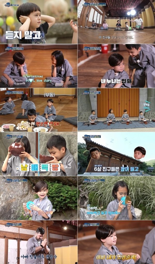 잠시 후 법복으로 갈아입은 윌&벤과 리리남매는 간식의 유혹을 이겨내며 청소하는 수행에 돌입했다. 청소 중 윌리엄은 첫사랑 리아가 힘겹게 물건을 옮기자 “내가 먼저 하고 빨리 도와줄게”라며 젠틀한 모습을 보였다. 하지만 리현이가 갑자기 윌리엄을 때려 모두를 어리둥절하게 만들었다. 누나를 빼앗겼다는 마음에 질투심이 발동했던 것. 이에 벤틀리는 “때리지 마. 내 친구야”라고 말했고, 리현이는 “친구 아니고 형아잖아”라고 정정해 현장을 초토화 시켰다.