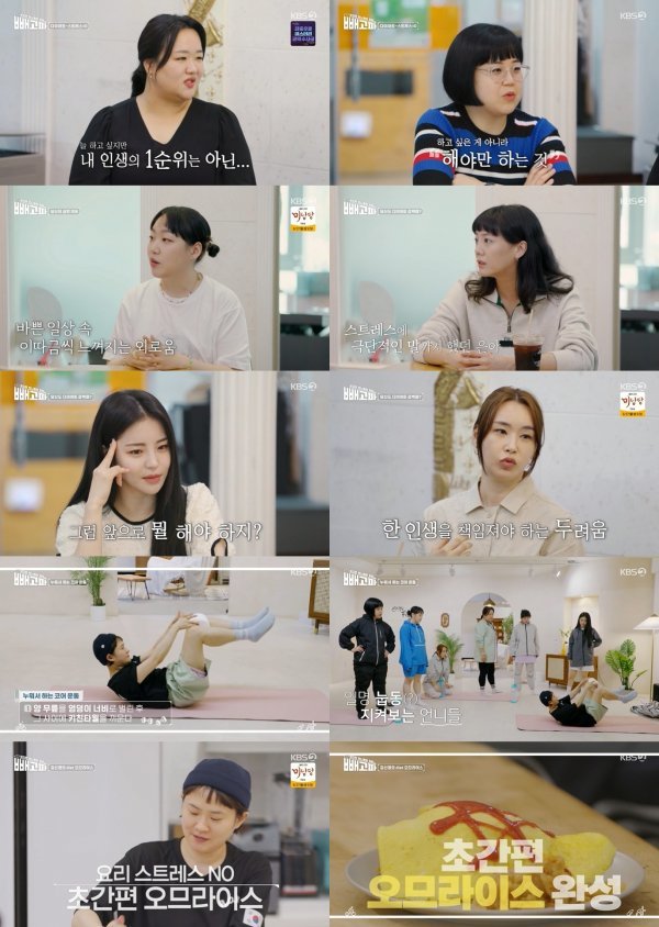 지난 25일 방송된 KBS 2TV ‘빼고파’(연출 최지나) 9회에서는 멤버들이 스트레스, 우울, 불안 검사 및 심리 상담을 받으며 마음을 치유하는 시간을 가졌다. 또 ‘요알못’ 다이어터들도 부담 없이 만들어 먹을 수 있는 김신영표 ‘초간편 오므라이스 레시피’부터 키친타월만 있으면 가능한 누워서 하는 코어 운동법까지 알려주며 ‘빼고파’ 시청자들에게 유익한 시간을 선사했다.