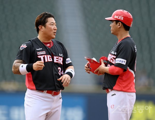 26일 서울 잠실야구장에서 ‘2022 신한은행 MY CAR KBO리그’ KIA 타이거즈와 두산 베어스 경기가 열렸다. 2회 이닝 교체 때 KIA 최형우가 조재영 코치와 이야기하고 있다.