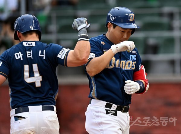 26일 인천 SSG 랜더스필드에서 ‘2022 신한은행 SOL KBO리그’ SSG 랜더스와 NC 다이노스의 경기가 열렸다. 6회초 무사에서 NC 양의지가 솔로 홈런을 쏘아 올린 후 동료와 기쁨을 나누고 있다.