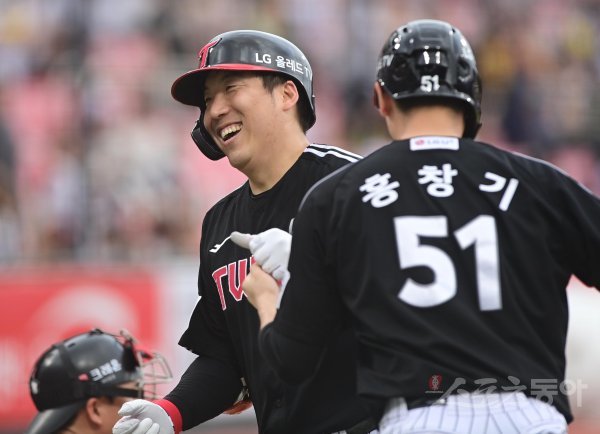 26일 경기도 수원KT위즈파크에서 열린 ‘2022 신한은행 SOL KBO리그’ KT 위즈와 LG 트윈스의 경기에서 1회초 1사 1루 LG 김현수가 선제 우월 2점 홈런을 쳐낸 뒤 동료의 축하를 받고 있다.