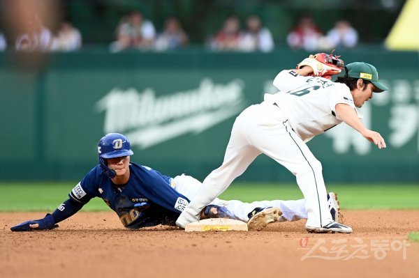 26일 인천 SSG 랜더스필드에서 ‘2022 신한은행 SOL KBO리그’ SSG 랜더스와 NC 다이노스의 경기가 열렸다. 7회초 1사 1, 3루에서 삼진 아웃 때 NC 2루 주자 김주원이 2루 도루를 성공시키고 있다. SSG가 비디오판독을 요청했지만 세이프.