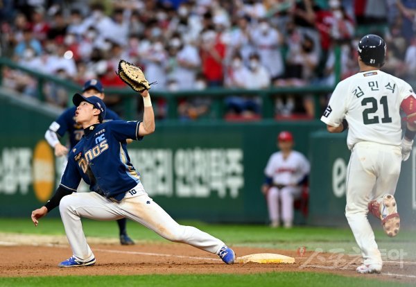 26일 인천 SSG 랜더스필드에서 ‘2022 신한은행 SOL KBO리그’ SSG 랜더스와 NC 다이노스의 경기가 열렸다. 7회말 무사에서 NC 도태훈이 번트 타구를 수비하려다 볼을 빠뜨리고 있다.