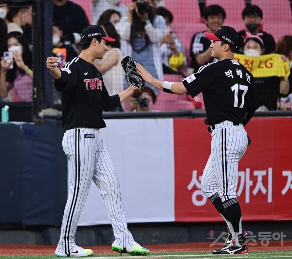 26일 경기도 수원KT위즈파크에서 열린 ‘2022 신한은행 SOL KBO리그’ KT 위즈와 LG 트윈스의 경기에서 8회말 수비를 마친 LG 이정용과 박해민이 하이파이브를 하고 있다.