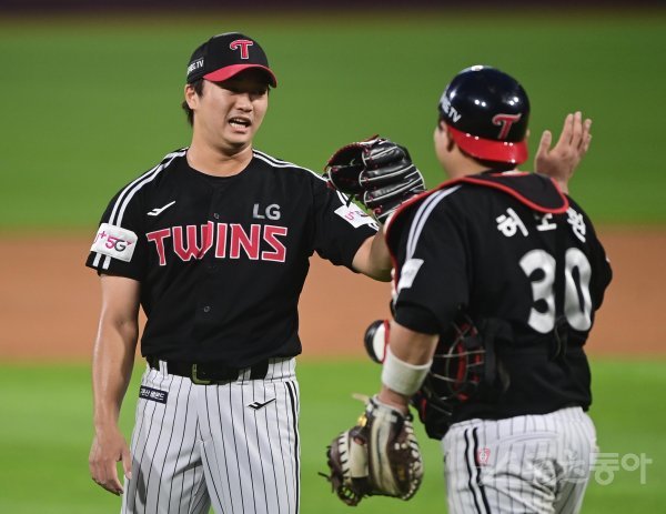 26일 경기도 수원KT위즈파크에서 열린 ‘2022 신한은행 SOL KBO리그’ KT 위즈와 LG 트윈스의 경기에서 KT에 3-1로 승리한 LG 고우석이 포수와 기쁨을 나누고 있다.