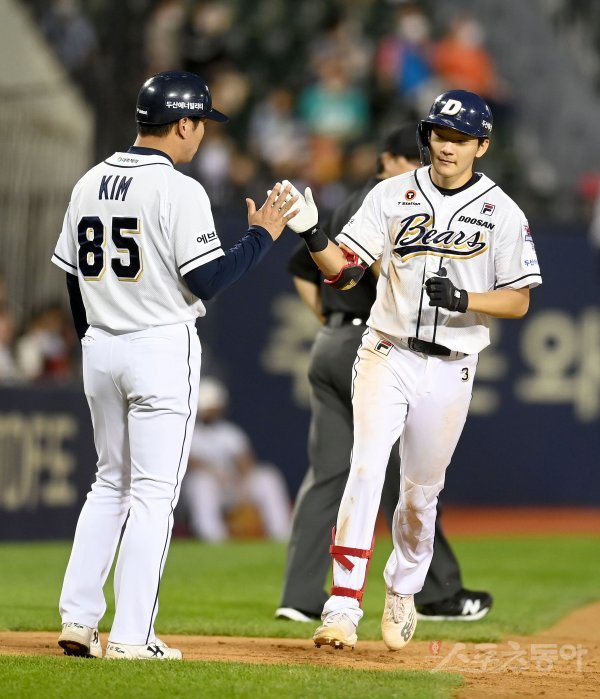 26일 서울 잠실야구장에서 ‘2022 신한은행 MY CAR KBO리그’ KIA 타이거즈와 두산 베어스 경기가 열렸다. 8회말 2사 1,2루 두산 안재석이 우중월 스리런 홈런을 날리고 그라운드를 돌아 홈인하고 있다.