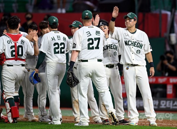 26일 인천 SSG 랜더스필드에서 ‘2022 신한은행 SOL KBO리그’ SSG 랜더스와 NC 다이노스의 경기가 열렸다. SSG가 NC를 상대로 7-3으로 승리한 후 선수들이 기쁨을 나누고 있다.