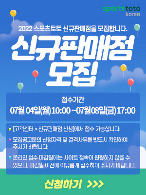 이번 신규 판매인 모집 공고는 지난 6월 20일(월)부터 오는 7월 1일(금)까지 약 2주간 이뤄지며, 신청 접수는 7월 4일(월) 오전 10시부터 8일(금) 오후 5시까지 스포츠토토 홈페이지 내 ‘신규 판매인 신청 접수’를 통해 신청이 가능하다.
