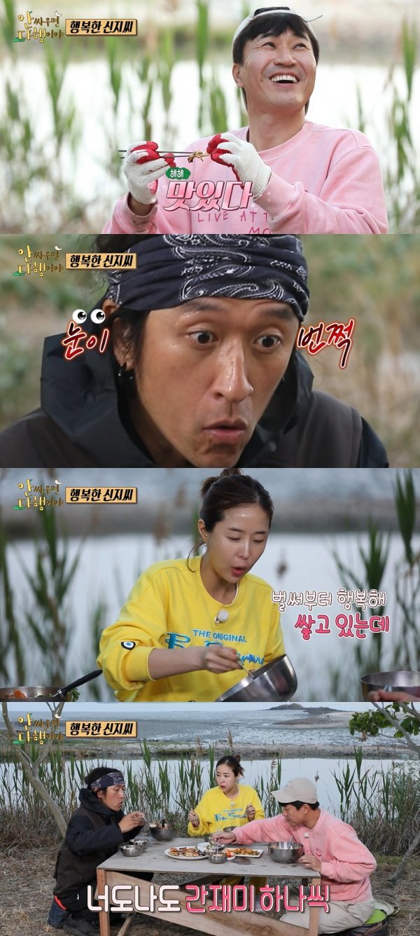 첫 식사 준비 역시 신지의 활약이 돋보였다. 신지에게 "앉아만 있어라"라며 호언장담한 김종민과 빽가는 허둥지둥하는 모습으로 신지를 답답하게 만들었고, 결국 간자미 손질부터 뒷정리, 요리까지 신지가 책임졌다. 코요태는 신지의 \'하드캐리\' 속에서 소라구이, 소라 무침, 숯불 직화 간자미 구이, 간자미 매운탕 등 풍성한 한상차림을 만들어냈다.