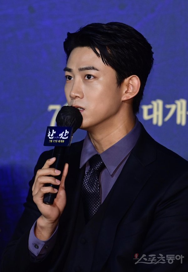 배우 옥택연이 28일 서울 광진구 자양동 롯데시네마 건대입구점에서 열린 영화 ‘한산: 용의 출현’ 제작보고회에서 질문에 답하고 있다.
