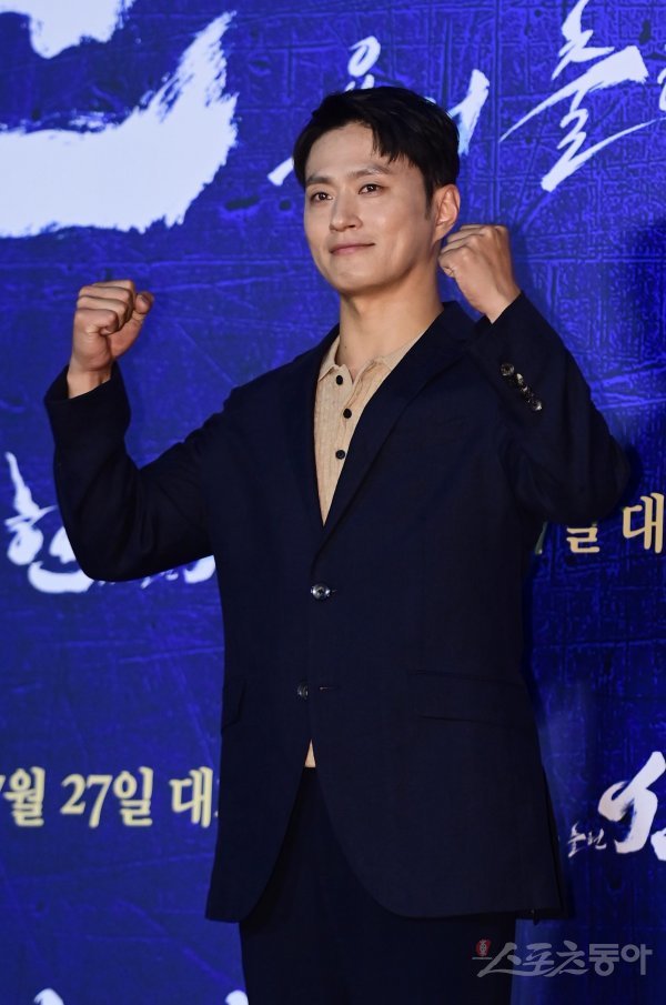 배우 김성규가 28일 서울 광진구 자양동 롯데시네마 건대입구점에서 열린 영화 ‘한산: 용의 출현’ 제작보고회에서 포즈를 취하고 있다.