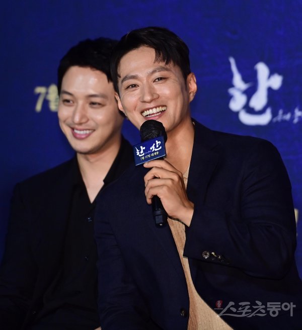 배우 김성규가 28일 서울 광진구 자양동 롯데시네마 건대입구점에서 열린 영화 ‘한산: 용의 출현’ 제작보고회에서 질문에 답하며 웃고 있다.