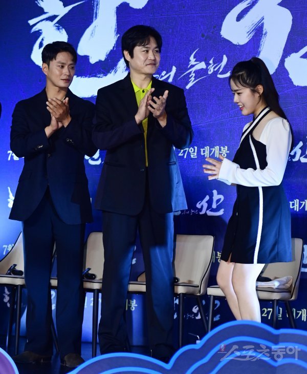 배우 김성규, 김성균이 28일 서울 광진구 자양동 롯데시네마 건대입구점에서 열린 영화 ‘한산: 용의 출현’ 제작보고회 무대에 오른 김향기를 향해 손뼉을 치고 있다.
