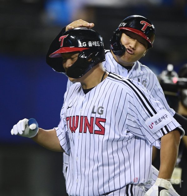 28일 서울 잠실야구장에서 열린 ‘2022 신한은행 SOL KBO리그’ LG 트윈스와 NC 다이노스의 경기에서 6회말 2사 1루 LG 이재원이 중월 2점 홈런을 쳐낸 후 1루주자 문보경의 축하를 받고 있다.