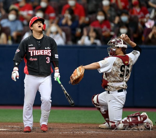 28일 서울 고척스카이돔에서 ‘2022 신한은행 MY CAR KBO리그’ KIA 타이거즈와 키움 히어로즈 경기가 열렸다. 7회초 무사 2루 KIA 김선빈이 삼진 아웃을 당하고 있다.