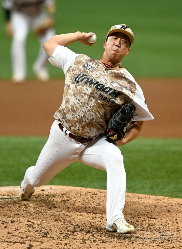 28일 서울 고척스카이돔에서 ‘2022 신한은행 MY CAR KBO리그’ KIA 타이거즈와 키움 히어로즈 경기가 열렸다. 9회초 등판해 1이닝을 무실점으로 막으며 세이브를 따낸 키움 문성현이 역투하고 있다.