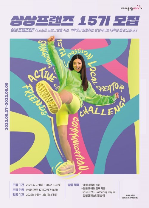 8월6일까지 상상유니브 홈페이지에서 지원할 수 있다. 전국 대학 재학생 및 휴학생이라면 누구나 지원 가능하며, 최종 선발된 192명은 9월부터 4개월간 상상유니브를 대표하는 ‘상상프렌즈 15기’로 활동하게 된다.
