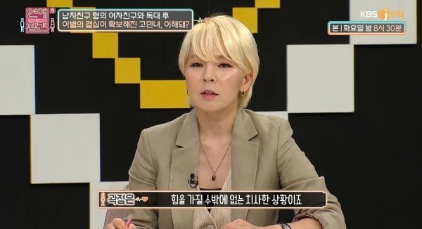 안타까운 상황에 김숙은 "두 사람이 왜 헤어져야 하는지 모르겠다. 형 커플은 왜 이렇게 당당하냐"며 황당해했고, 곽정은은 "형에겐 도덕적 결함이 있으니까 우리가 고민녀 커플에게 힘을 실어줄 수 있지만 현실에선 먹히지 않는 얘기다. 고민녀 커플은 최약체다. 가족으로 승인받은 사람들이 파워를 지닐 수밖에 없는 치사한 상황"이라며 냉정하게 판단을 내렸다.