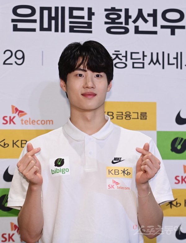 수영 선수 황선우가 29일 서울 강남구 신사동 CGV 청담씨네시티에서 열린 ‘2022 국제수영연맹(FINA) 부다페스트 세계선수권대회’ 자유형 200m에서 은메달 획득 기자간담회에서 포즈를 취하고 있다.