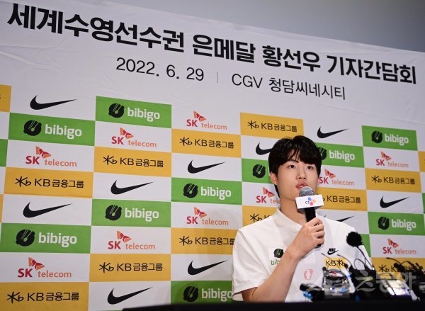 수영 선수 황선우가 29일 서울 강남구 신사동 CGV 청담씨네시티에서 열린 ‘2022 국제수영연맹(FINA) 부다페스트 세계선수권대회’ 자유형 200m에서 은메달 획득 기자간담회에서 취재진의 질문에 답하고 있다.