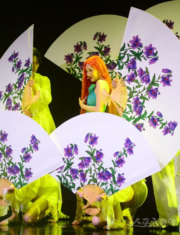 가수 선미가 29일 서울 마포구 신한play스퀘어에서 진행된 디지털 싱글 ‘열이 올라요(Heart Burn)’ 발매 쇼케이스에서 화려한 공연을 펼치고 있다.
