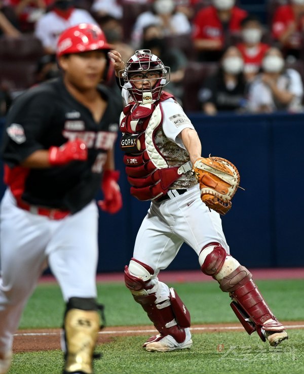29일 서울 고척 스카이돔에서 ‘2022 신한은행 SOL KBO리그’ 키움 히어로즈와 KIA 타이거즈의 경기가 열렸다. 4회초 2사 3루에서 키움 이지영이 포수 앞 땅볼 타구를 잡아 1루로 송구하고 있다.