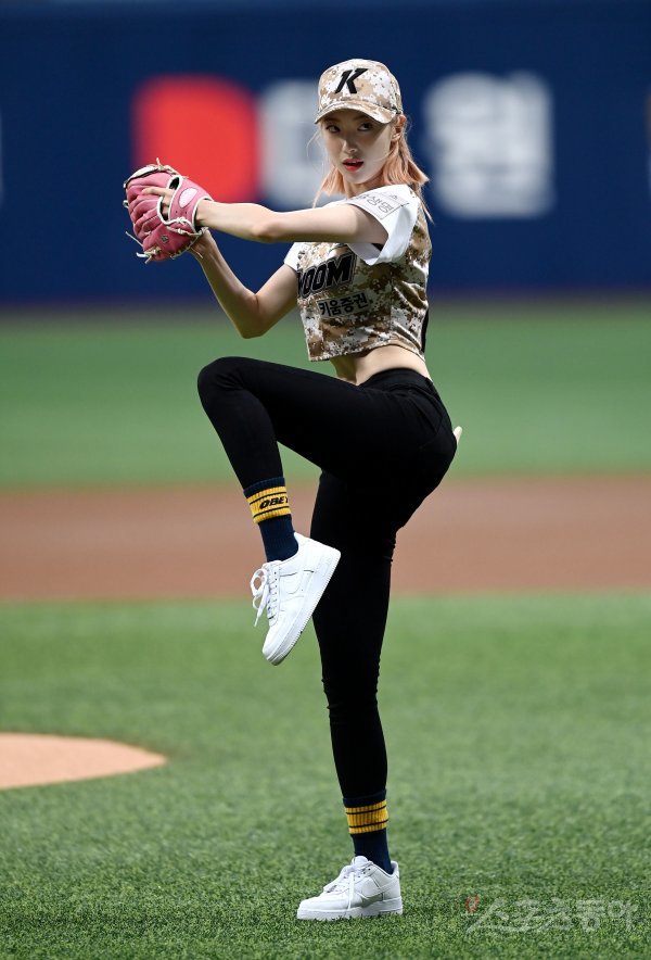 29일 서울 고척 스카이돔에서 ‘2022 신한은행 SOL KBO리그’ 키움 히어로즈와 KIA 타이거즈의 경기가 열렸다. 걸그룹 하이키의 리이나가 시구를 던지고 있다.