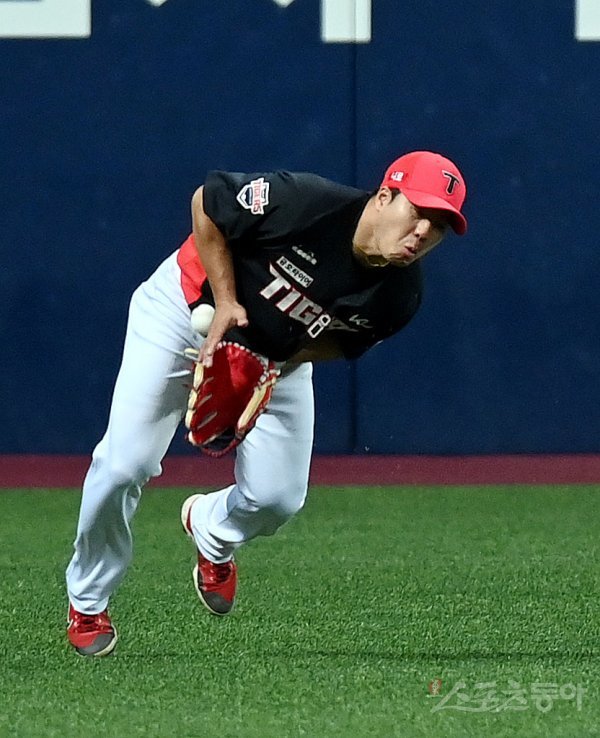 29일 서울 고척 스카이돔에서 ‘2022 신한은행 SOL KBO리그’ 키움 히어로즈와 KIA 타이거즈의 경기가 열렸다. 1회말 2사에서 KIA 이창진이 플라이 타구를 잡으려고 수비를 펼쳤으나 볼을 빠뜨리고 있다.