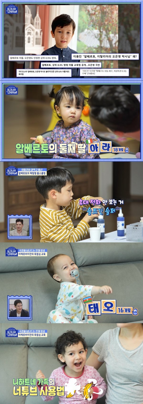 이날 방송에서 알베르토는 상위 0.3% 아들 레오가 좋아하는 과학 실험을 준비하며 알베르토만의 홈스쿨링 법을 보여준다. 그러나 실험 도중 실험 도구에 호기심을 가지며 이것저것 만져보는 동생 아라 때문에 화가 난 레오는 알베르토에게 “아빠! 아라에게 스마트폰 보여주면 안 돼?”냐며 물었다.