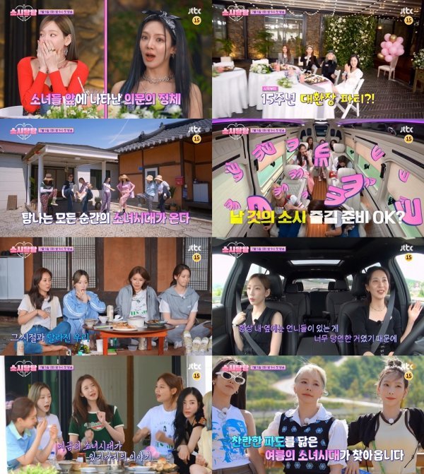 제작진에 따르면 먼저 15주년 파티에서 소녀시대는 지금까지 활동했던 무대가 떠오르는 의상을 착용해 반가운 추억을 소환한다. 이어 수영과 유리의 티격태격 케미는 물론 갑자기 등장한 문에 놀라는 멤버들의 깨알 리액션에서는 여전한 예능감이 느껴진다.