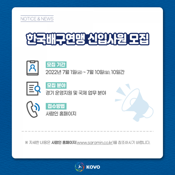 KOVO는 30일 경기 운영지원 및 국제 업무 분야 신입사원을 모집한다고 전했다. 주요 자격조건은 대학 졸업자로 해외여행에 결격 사유가 없고, 스포츠에 대한 열정과 이해도가 높은 사람은 누구나 지원 가능하다.
