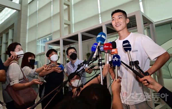 육상 높이뛰기 국가대표 우상혁이 ‘2022 오리건 세계육상선수권대회’에 출전하기 위해 30일 인천국제공항 2터미널에서 출국 인터뷰를 하고 있다.