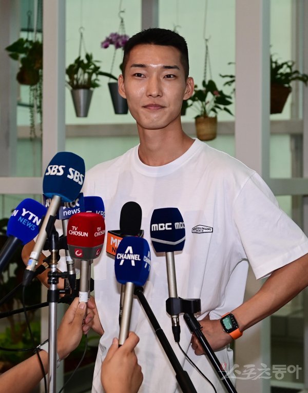 육상 높이뛰기 국가대표 우상혁이 ‘2022 오리건 세계육상선수권대회’에 출전하기 위해 30일 인천국제공항 2터미널에서 출국 인터뷰를 하고 있다.
