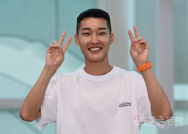 육상 높이뛰기 국가대표 우상혁이 ‘2022 오리건 세계육상선수권대회’에 출전하기 위해 30일 인천국제공항 2터미널에서 출국 인터뷰를 마친 후 포즈를 취하고 있다.