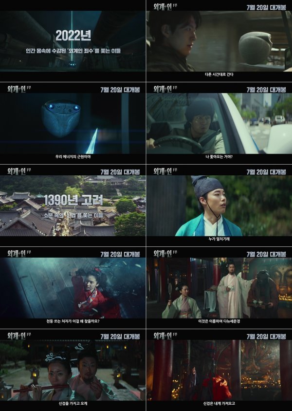 ‘외계+인’ 1부는 고려 말 소문 속의 신검을 차지하려는 도사들과 2022년 인간의 몸 속에 수감된 외계인 죄수를 쫓는 이들 사이에 시간의 문이 열리며 펼쳐지는 이야기를 그린 영화다.