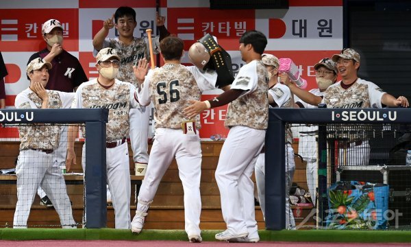 30일 서울 고척스카이돔에서 ‘2022 신한은행 MY CAR KBO리그’ KIA 타이거즈와 키움 히어로즈 경기가 열렸다. 4회말 무사 키움 이지영이 좌월 솔로 홈런을 날린 후 그라운드를 돌아 홈인해 홍원기 감독의 축하를 받고 있다.