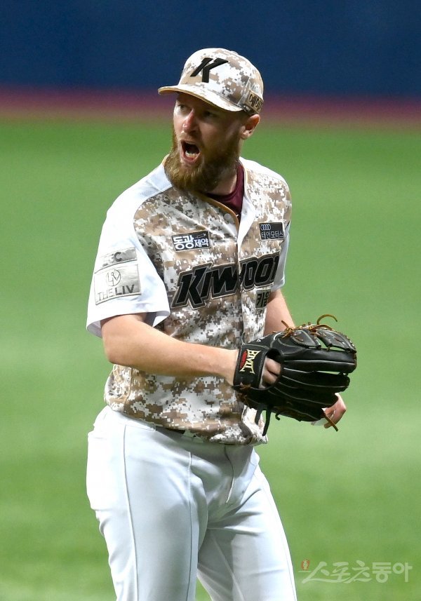 30일 서울 고척스카이돔에서 ‘2022 신한은행 MY CAR KBO리그’ KIA 타이거즈와 키움 히어로즈 경기가 열렸다. 선발 투수로 등판한 키움 요키시가 2회초 2사 만루 상황에서 KIA 타선을 1루수 앞 땅볼로 아웃시킨 후 포효하고 있다.