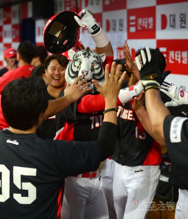 30일 서울 고척스카이돔에서 ‘2022 신한은행 MY CAR KBO리그’ KIA 타이거즈와 키움 히어로즈 경기가 열렸다. 6회말 1사 1루 KIA 박동원이 우월 투런 홈런을 날리고 그라운드를 돌아 홈인해 호랑이 마스크를 착용한 후 기뻐하고 있다.