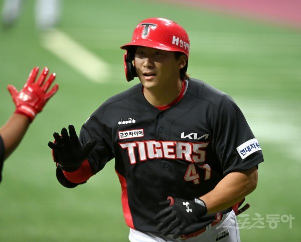 30일 서울 고척스카이돔에서 ‘2022 신한은행 MY CAR KBO리그’ KIA 타이거즈와 키움 히어로즈 경기가 열렸다. 7회초 1사 KIA 나성범이 역전 좌월 솔로 홈런을 날린 후 그라운드를 돌아 홈인해 하이파이브 하고 있다.