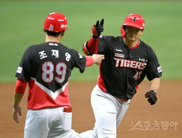 30일 서울 고척스카이돔에서 ‘2022 신한은행 MY CAR KBO리그’ KIA 타이거즈와 키움 히어로즈 경기가 열렸다. 7회초 1사 KIA 나성범이 역전 좌월 솔로 홈런을 날린 후 그라운드를 돌며 기뻐하고 있다.