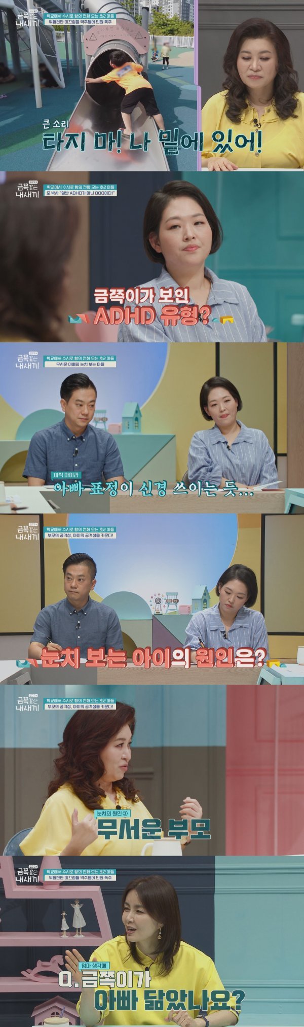 이어지는 영상에서는 주말을 맞아 공원 나들이에 나선 가족들이 보인다. 신이 나서 놀이터로 뛰어 간 금쪽이와, 걱정스러운 마음으로 금쪽이가 잘 보이는 곳에 돗자리를 펴고 자리를 잡은 엄마와 아빠. 아니나 다를까, 금쪽이는 미끄럼틀을 거꾸로 오르며 친구들을 방해하기 시작한다. “위에 있는 애들에게 전해! 내가 밑에 있으니까 내려오지 말라고!”라고 소리치고, 그러지 말라는 다른 아이에게는 되레 화를 내는데. 금쪽이의 적반하장 태도를 본 부모는 할 말을 잃는다.