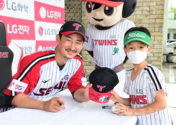 3일 서울 잠실야구장에서 열린 ‘2022 신한은행 SOL KBO리그’ LG 트윈스와 롯데 자이언츠의 경기에 앞서 박용택이 은퇴 기념 팬사인회에서 팬과 함께 기념 촬영을 하고 있다.