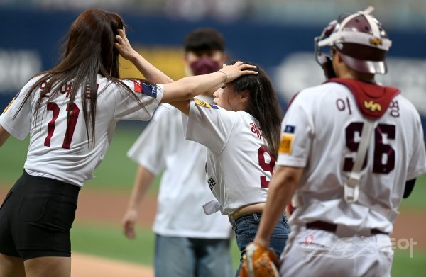 3일 서울 고척스카이돔에서 ‘2022 신한은행 MY CAR KBO리그’ 한화이글스와 키움 히어로즈 경기가 열렸다. 경기 전 개그맨 혜지대지와 연예림이 시구와 시타를 마친 후 난투극 상황을 연기하고 있다.