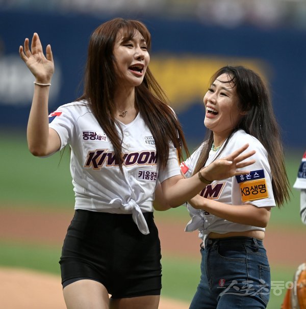 3일 서울 고척스카이돔에서 ‘2022 신한은행 MY CAR KBO리그’ 한화이글스와 키움 히어로즈 경기가 열렸다. 경기 전 개그맨 혜지대지와 연예림이 시구와 시타를 마친 후 팬들에게 인사하고 있다.