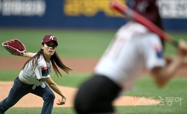 3일 서울 고척스카이돔에서 ‘2022 신한은행 MY CAR KBO리그’ 한화이글스와 키움 히어로즈 경기가 열렸다. 경기 전 개그맨 혜지대지가 시구를 하고 있다.