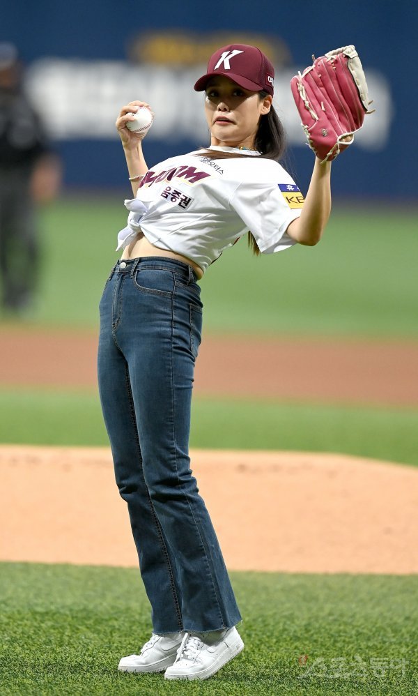 3일 서울 고척스카이돔에서 ‘2022 신한은행 MY CAR KBO리그’ 한화이글스와 키움 히어로즈 경기가 열렸다. 경기 전 개그맨 혜지대지가 시구를 하고 있다.