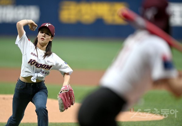 3일 서울 고척스카이돔에서 ‘2022 신한은행 MY CAR KBO리그’ 한화이글스와 키움 히어로즈 경기가 열렸다. 경기 전 개그맨 혜지대지가 시구를 하고 있다.