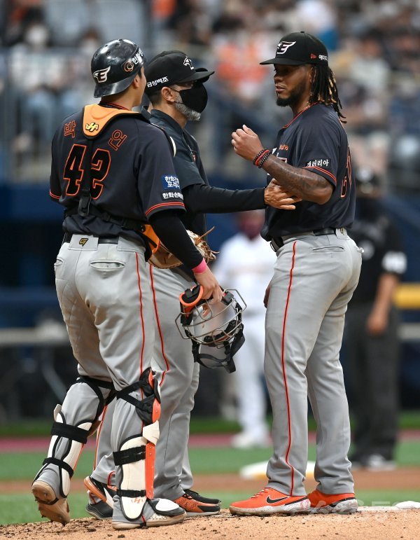 3일 서울 고척스카이돔에서 ‘2022 신한은행 MY CAR KBO리그’ 한화이글스와 키움 히어로즈 경기가 열렸다. 선발 투수로 등판한 한화 페냐가 4회말 2사 1루 상황에서 교체되고 있다.