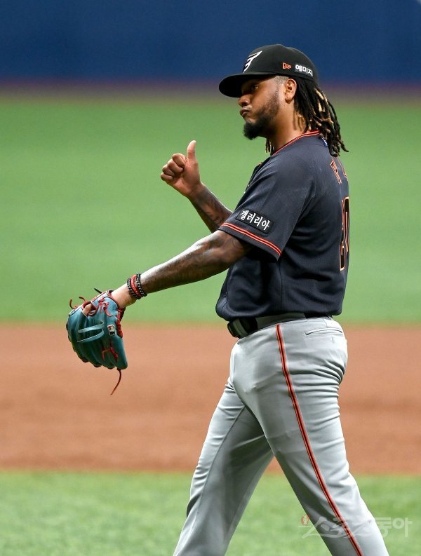 3일 서울 고척스카이돔에서 ‘2022 신한은행 MY CAR KBO리그’ 한화이글스와 키움 히어로즈 경기가 열렸다. 선발 투수로 등판한 한화 페냐가 1회를 무실점으로 막은후 더그아웃으로 들어가며 포수를 향해 엄지손가락을 들어 보이고 있다.
