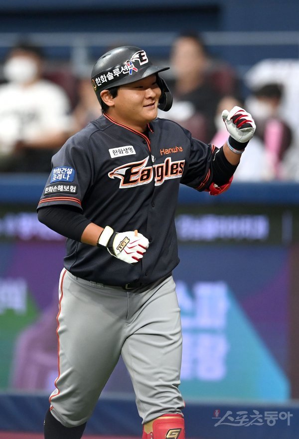 3일 서울 고척스카이돔에서 ‘2022 신한은행 MY CAR KBO리그’ 한화이글스와 키움 히어로즈 경기가 열렸다. 1회초 1사 한화 김태연이 선제 좌월 솔로 홈런을 날리고 그라운드를 돌아 홈인해 하이파이브 하고 있다.